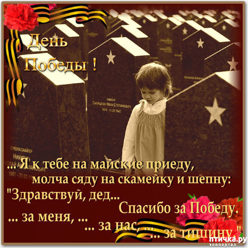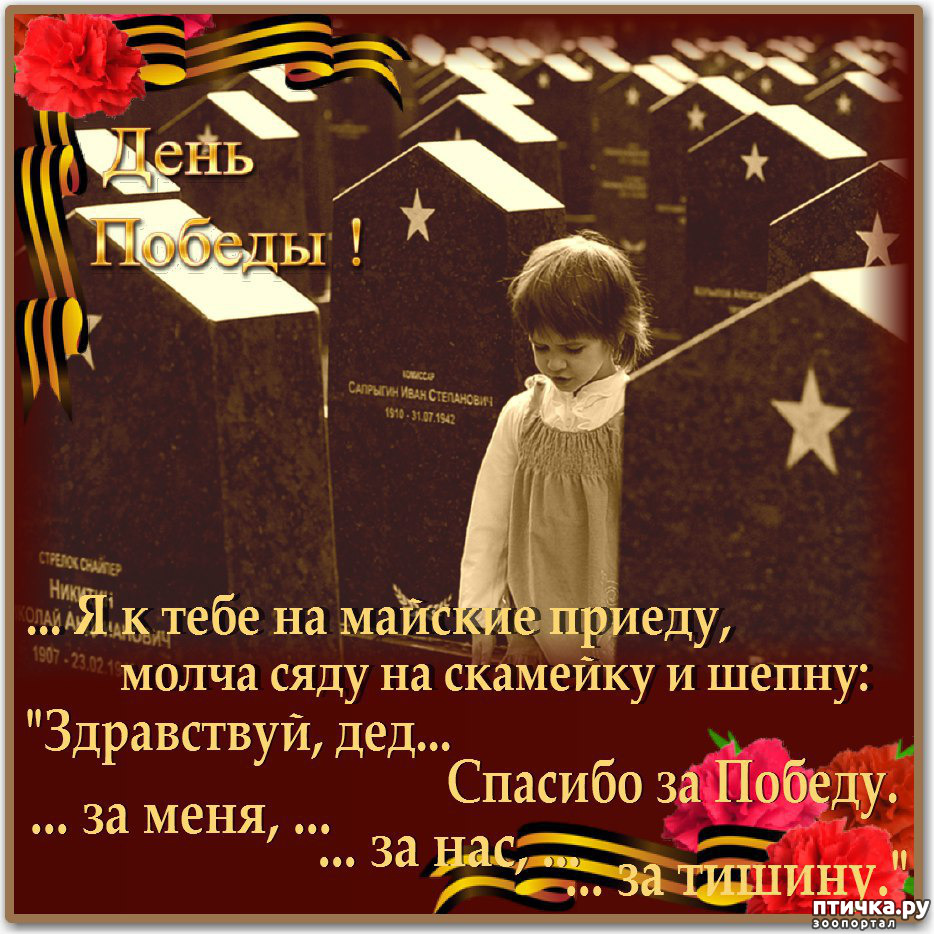 Об этом нужно помнить всегда! Весна сорок пятого... Победный день со слезами радости на глазах и горечи на губах... Сколько их, защищавших своих детей, матерей, жён не вернулись с полей войны в свои родные дома и семьи... Сколько матерей оплакивали своих сыновей, жёны - мужей, дети - отцов... Никогда не забывать об этом! Будем помнить, какой ценой была завоёвана Великая Победа! Мирного неба всем нам, дорогие друзья! С ВЕЛИКИМ ПРАЗДНИКОМ ПОБЕДЫ!