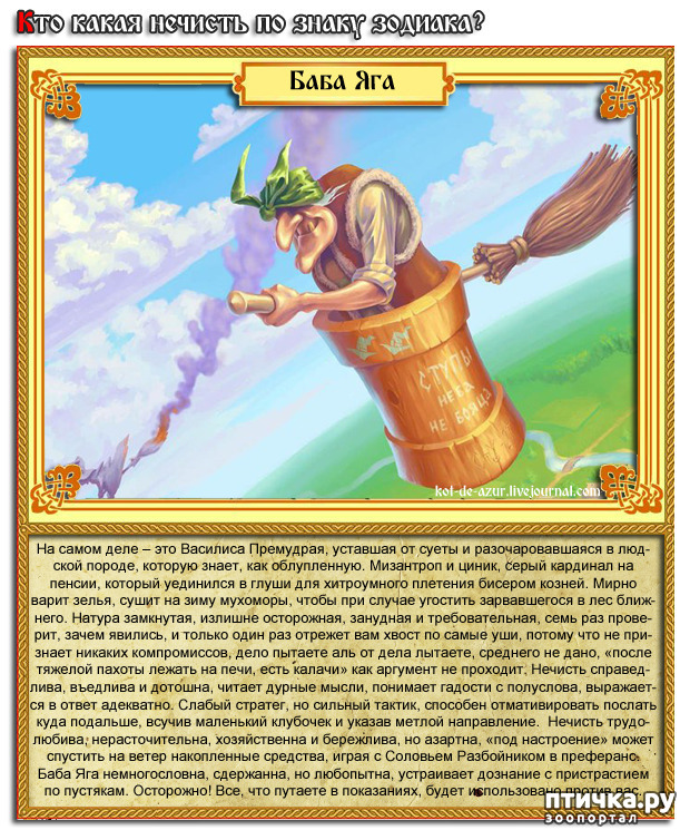 " У Яги в избушке идеальная организация труда, зелья расставлены в правильном беспорядке, пауки ткут паутину в строго отведённых углах, кот гадит исключительно, где придётся, мыши строятся и бегают в чёткой последовательности, мухи летают по намеченной траектории."