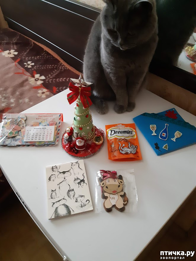 Чего тут только нет! Календарь, деревянная игрушка на елку, блокнот с котами, вкусняшка для кота, новогоднее саше и елочка. Если бы я не знала, что Ириша мастерица-рукодельница увлекается "новогодним" творчеством, ни за что бы не подумала, что елочка - это ее рук дело. Столько труда и так красиво!