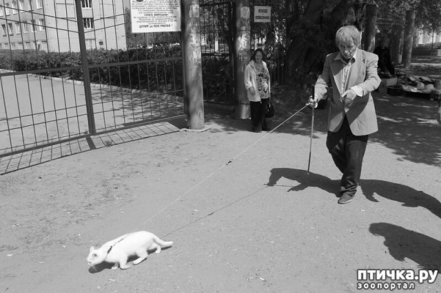 Встречал я пару раз этого человека в тёмных очках на улице, с огромным котом на поводке. Но вот как-то не приходило мне в голову подойти. Не приходило, пока что называется, не столкнулся нос к носу. А столкнувшись, я увидел, что он слепой и идёт с палочкой для слепых, вот только... Только вёл его совсем не сенбернар или другой пёс. А вёл его на поводке кот невероятных размеров.