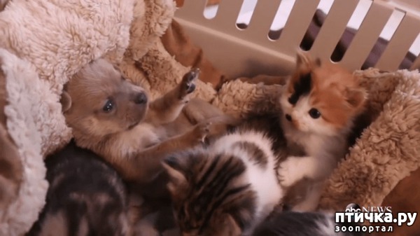 Приемная кошачья мама проигнорировала инициативу людей — пока те рассуждали, как бы деликатнее убедить её покормить щенка, Гвен уже разместила его среди своих котят и начала вылизывать. Спустя несколько дней дней щенок был почти неотличим от котят, буквально стал частью их семьи. Вместе кушали, спали, учились открывать глазки и стоять на лапках.