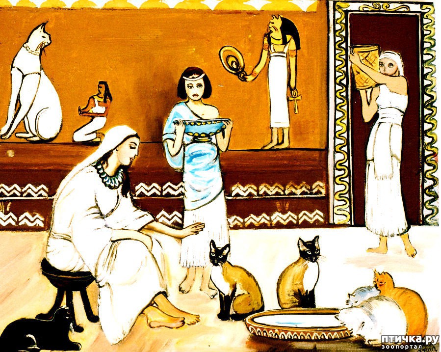Дж. Р. Вегелин. Погребальный обряд кошки (1886). На особое место кошек в ряду животных, почитаемых Египтянами, обращал внимание ещё древний грек Геродот (ок. 484 — ок. 425 до н. э.). «Отец истории» писал в своей «Евтерпе»:Хотя у египтян много домашних животных, но их было бы ещё гораздо больше, если бы с кошками не происходило вот какого странного явления. Всякий раз, как у кошек появляются на свет котята, они уже больше не идут к котам, а те, желая с ними спариться, не находят их. Поэтому коты прибегают к такой хитрости: они силой похищают котят у кошек, умерщвляют их, но не пожирают. А кошки, лишившись своих котят и желая снова иметь других, приходят тогда к котам. Ведь это животное любит детёнышей. Во время пожара с кошками творится что? то удивительное. Египтяне не заботятся о тушении огня, а оцепляют горящее пространство и стерегут кошек, а те все же успевают проскользнуть между людей и, перескочив через них, бросаются в огонь. Это повергает египтян в великое горе. Если в доме околеет кошка, то все обитатели дома сбривают себе брови.