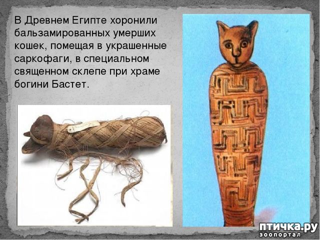 Умерших животных мумифицировали, оборачивая в льняную ткань с орнаментами и священными молитвами и умащивая тело благовониями и маслами. Считалось, что душа питомца благодаря этому обряду обретет способность возрождаться в новом теле. Богатые граждане надевали на мумию золотую маску, помещали ее в деревянный, бронзовый или золотой саркофаг и оставляли в гробнице любимые игрушки и забальзамированные тушки мышей.