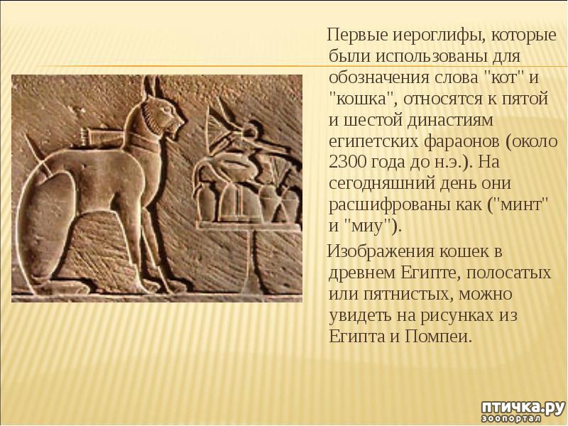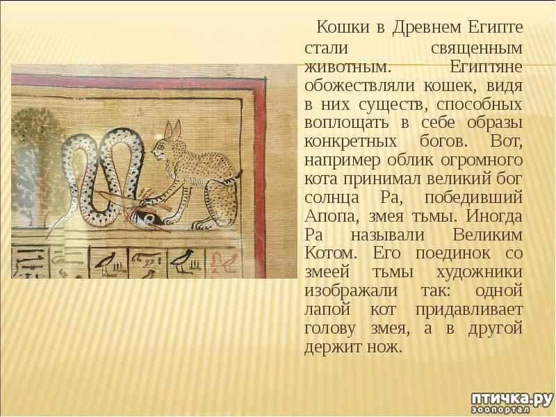 Вот, такие интересные факты из истории древних веков о поклонении кошкам, дошедшие до наших времён. Удивительные животные и удивителен тот факт, что именно кошкам было отведено столь достойное место в истории. Вот и представим себе, как мы должны относиться к этому животному из семейства кошачьих? Как можно пройти мимо кошачьей трагедии и не помочь животному в трудной ситуации? Как, вообще, можно не любить этих особенных животных, даже не смотря на их достойную историю, идущую от, прославивших их, древних египтян?
