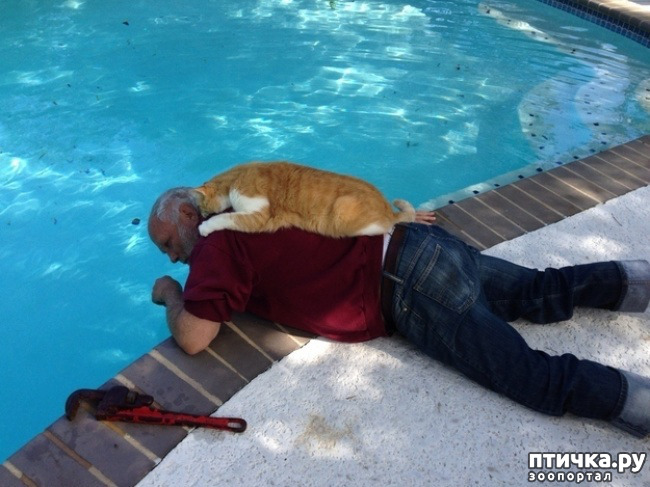 Этот кот все время сопровождает своего хозяина, который работает чистильщиком бассейнов.