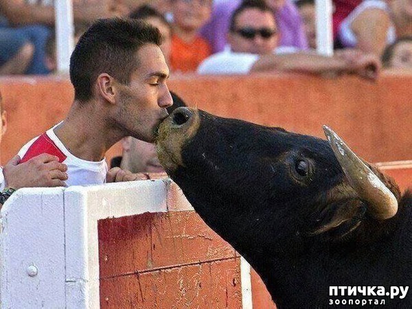 Этот случай на корриде поразил весь мир. Мужчина, который запечатлен на фотографии, вырастил этого большого и сильно быка. Животное росло под его присмотром и привязалось к человеку.