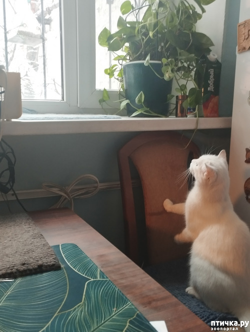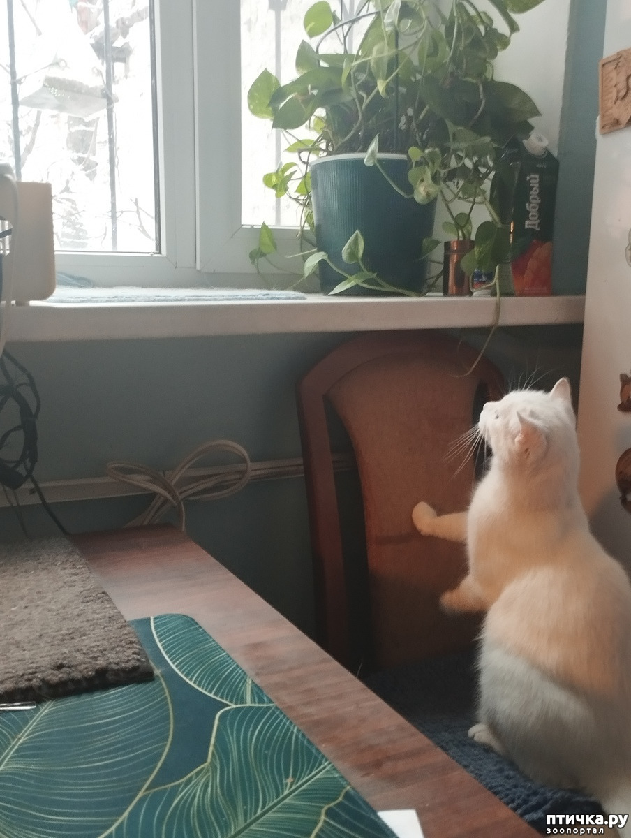 Написать комментарийА синицы всё летают и летают на кормушку, а Диана всё караулит и ловит, но увы...нехорошие такие синицы, через стекло в лапы не даются.