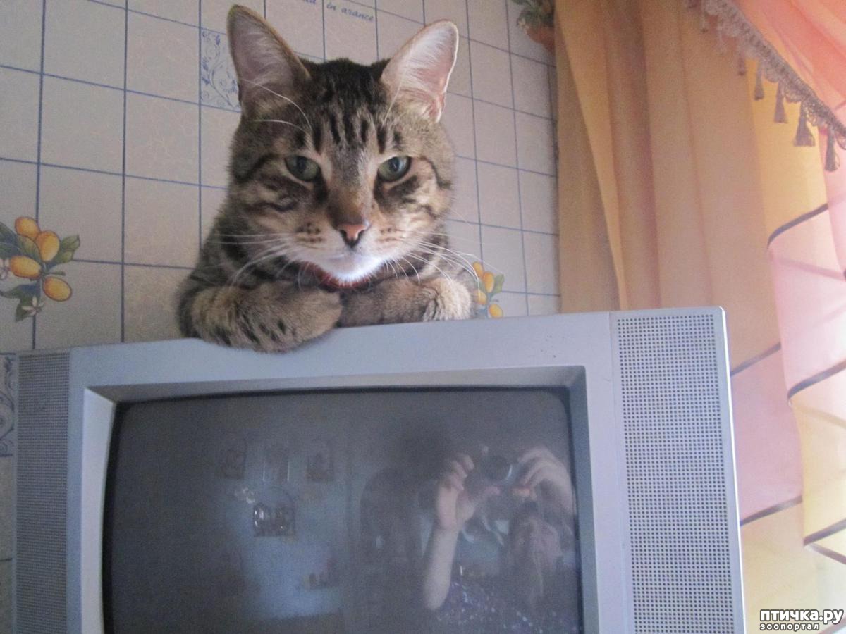 Но с появление собаки обиделся и начал постоянно спать на кухне на телевизоре. Василий ещё и трусишка у нас жуткий, только видит чужого в доме, сразу забивается под диван.