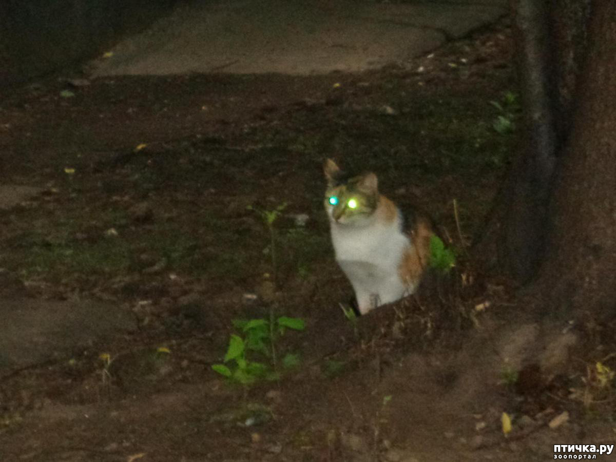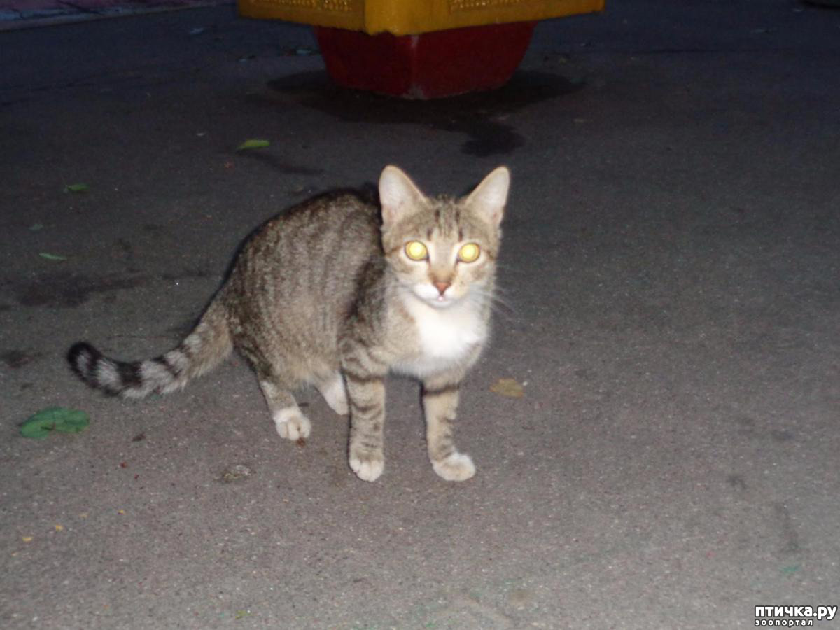 Опять в полутьме (освещена только проезжая часть, на тротуаре – тень от деревьев, доходим до места. Кошки крутятся у ног, Дымок деликатно сидит чуть в стороне в ожидании своей порции. Зову «кис, кис» и раскладываю посуду. Прибегает вездесущий Заяц, успевший пробежать подвалом на другую сторону дома, два Рыжика, Злата, Алисаи Кнопка. Присмотревшись, вижу вдали у дерева Тимофея. Его легко спутать с Мурзиком, они очень похожи окраской, но Тимофея отличают белые уши (у Мурзика они тёмные), хорошо заметные даже при слабом свете.