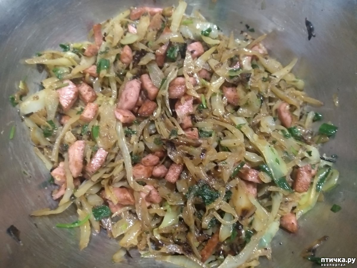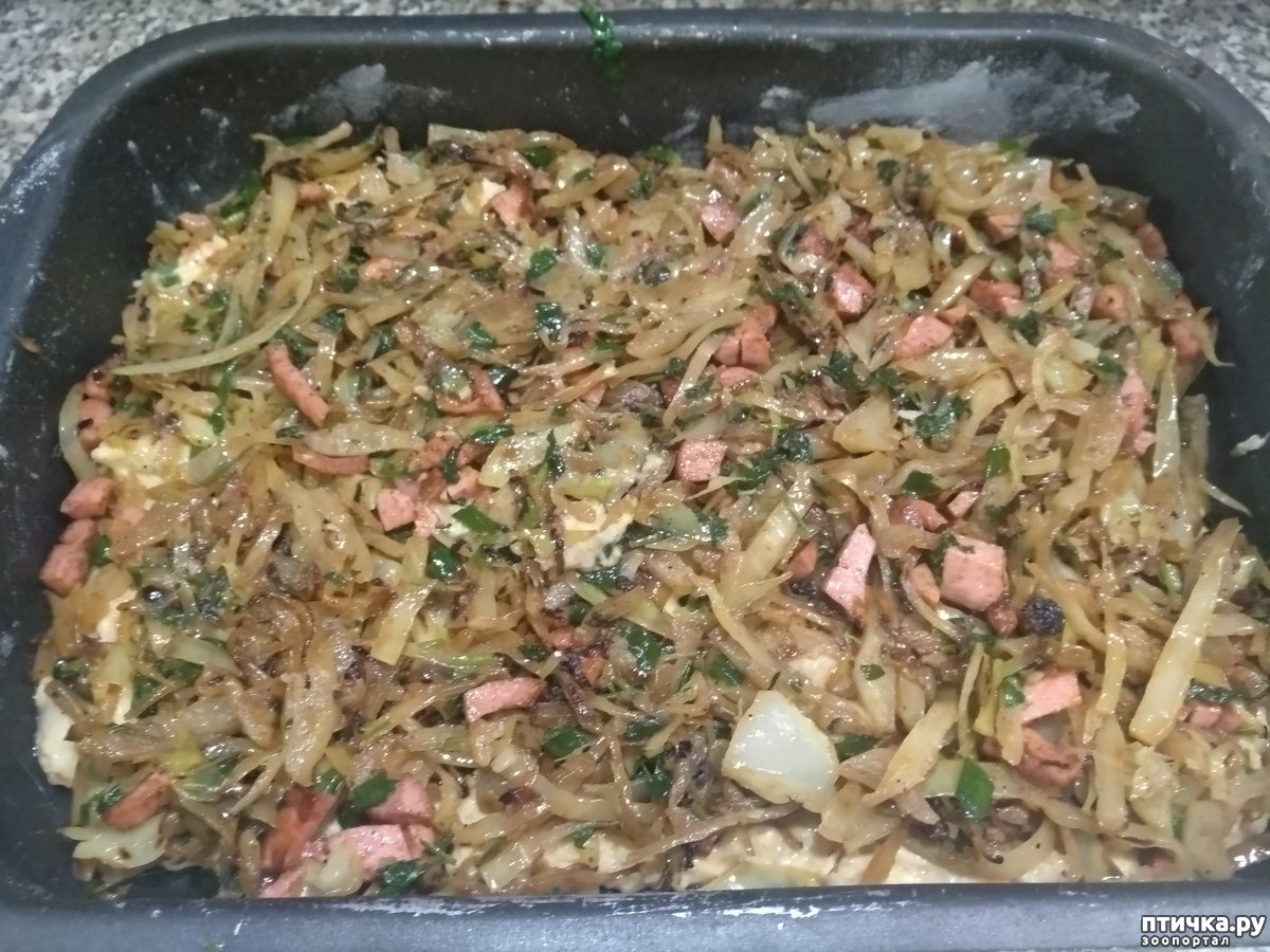 Для своего пирога я выбрала отварной рис, Который я готовила с морковью, остатки макарон, капусту, оставшуюся от начинки пирожков и добавила небольшой кусочек ветчины.