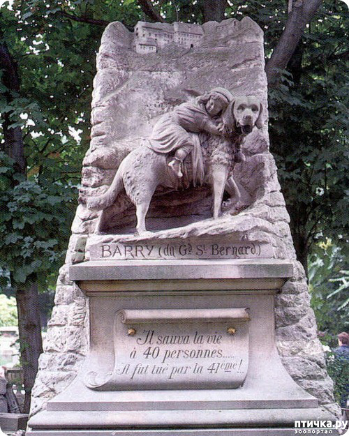 В Париже есть памятник сенбернару. Сенбернар Барри – вполне реальный персонаж начала 19 века. О том, что именно сенбернары испытывают исключительную любовь к человеку, не знает разве лишь тот, кто вообще ничего не знает о собаках. Барри исполнял в этом далеком веке свою обычную нелегкую работу: спасал людей в горах. Снежные заносы в Альпах всегда уносили тысячи человеческих жизней. Барри, по мере сил, пытался исправить эту печальную статистику. 40 спасенных жизней – это серьезный результат, за который уже стоит ставить памятник.